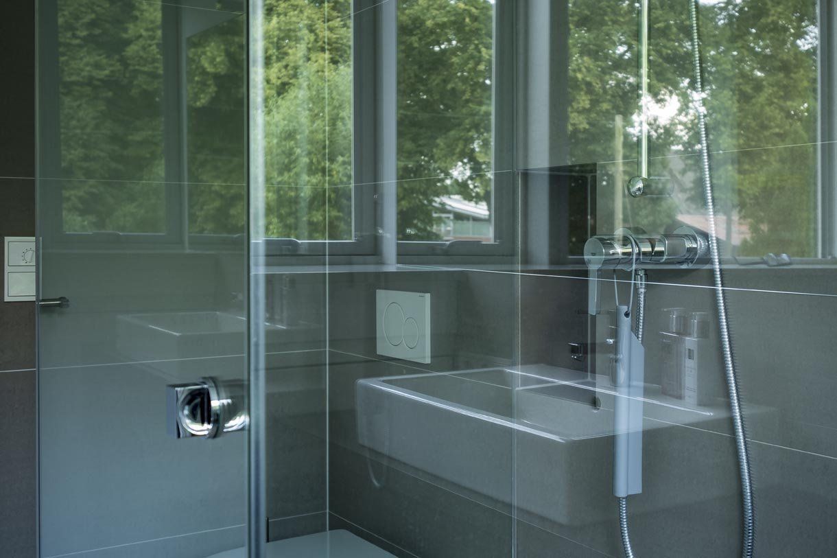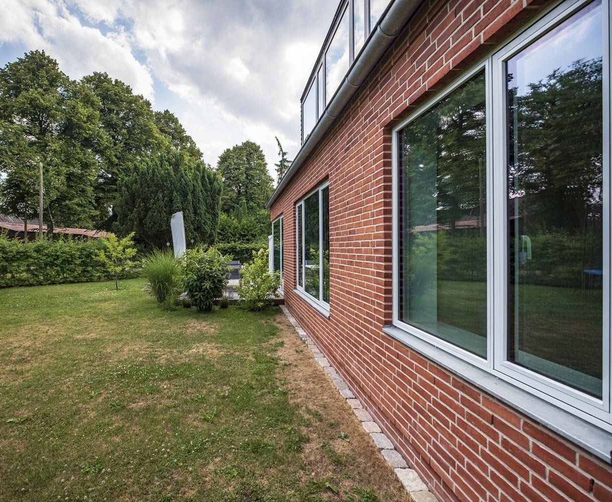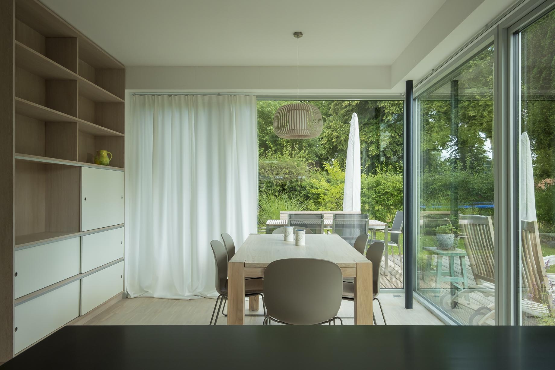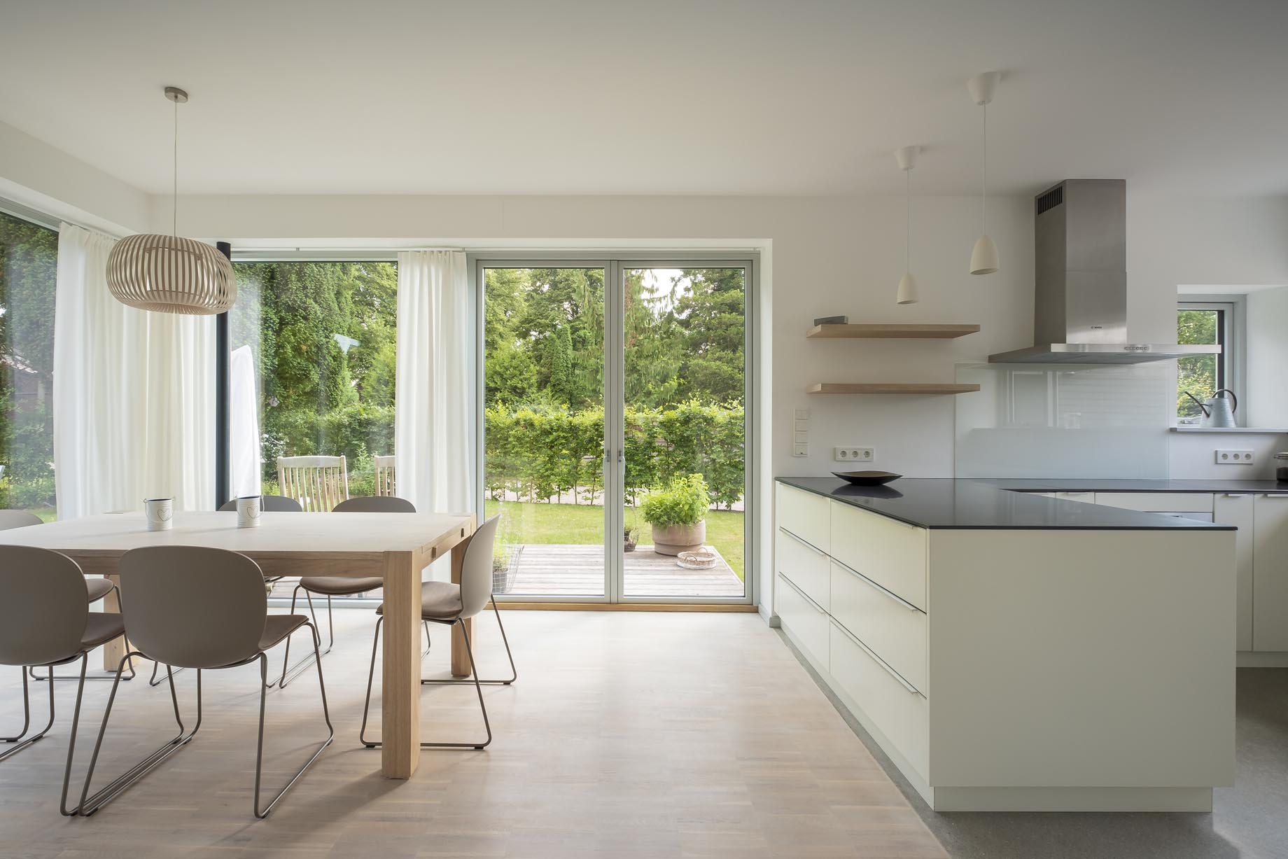 Offene Raumabfolgen mit großformatigen Fensterelementen erzielen großzügige Raumwirkungen. Schiebeelemente ermöglichen eine flexible Separierbarkeit.