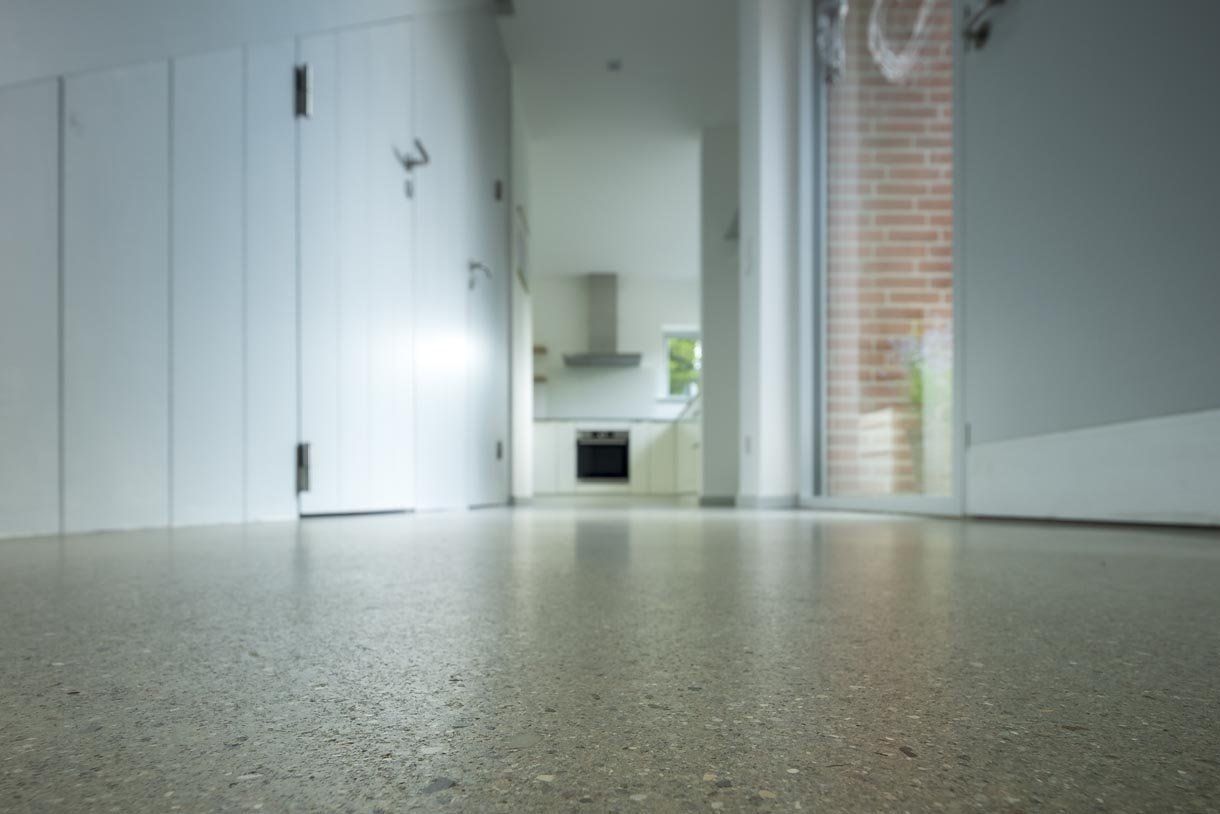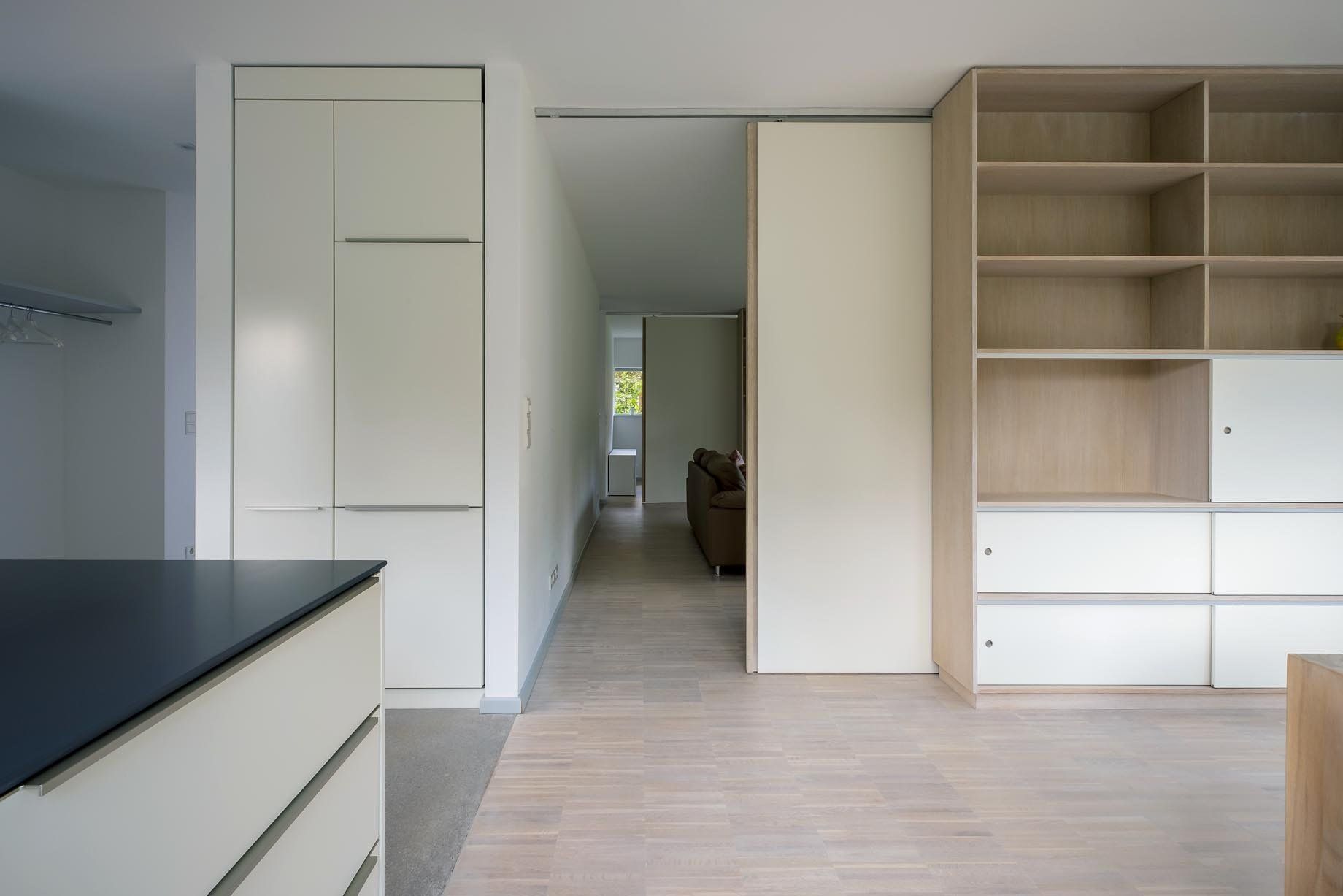 Ein überschaubarer Materialmix aus geschliffenem Zementestrich, gelaugtem Eichenparkett und mineralischen Wandoberflächen vervollständigen den zeitgemäßen Charakter der Innenräume.