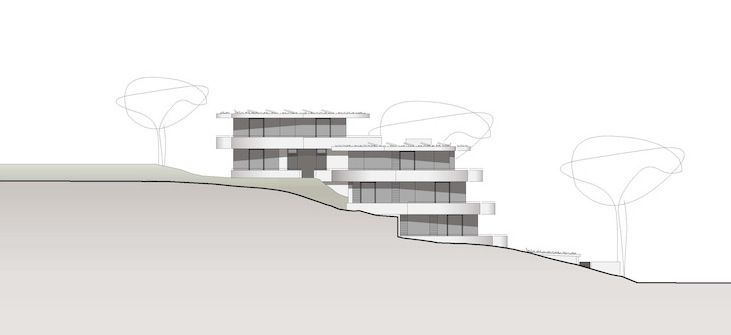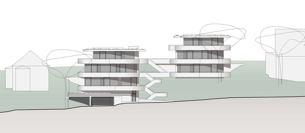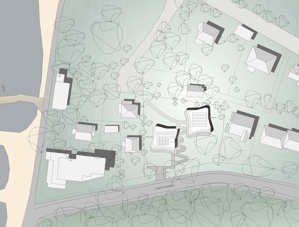 Die Volumen der beiden Baukörper fügen sich auf dem höchstgelegenen Grundstück des Ernestinenweges maßstäblich in den unmittelbaren nachbarlichen Kontext ein. Sie folgen dem Verlauf der Topographie und vermitteln zwischen den westlich und östlich anschließenden unterschied-lichen Gebäudefluchten und -höhen.