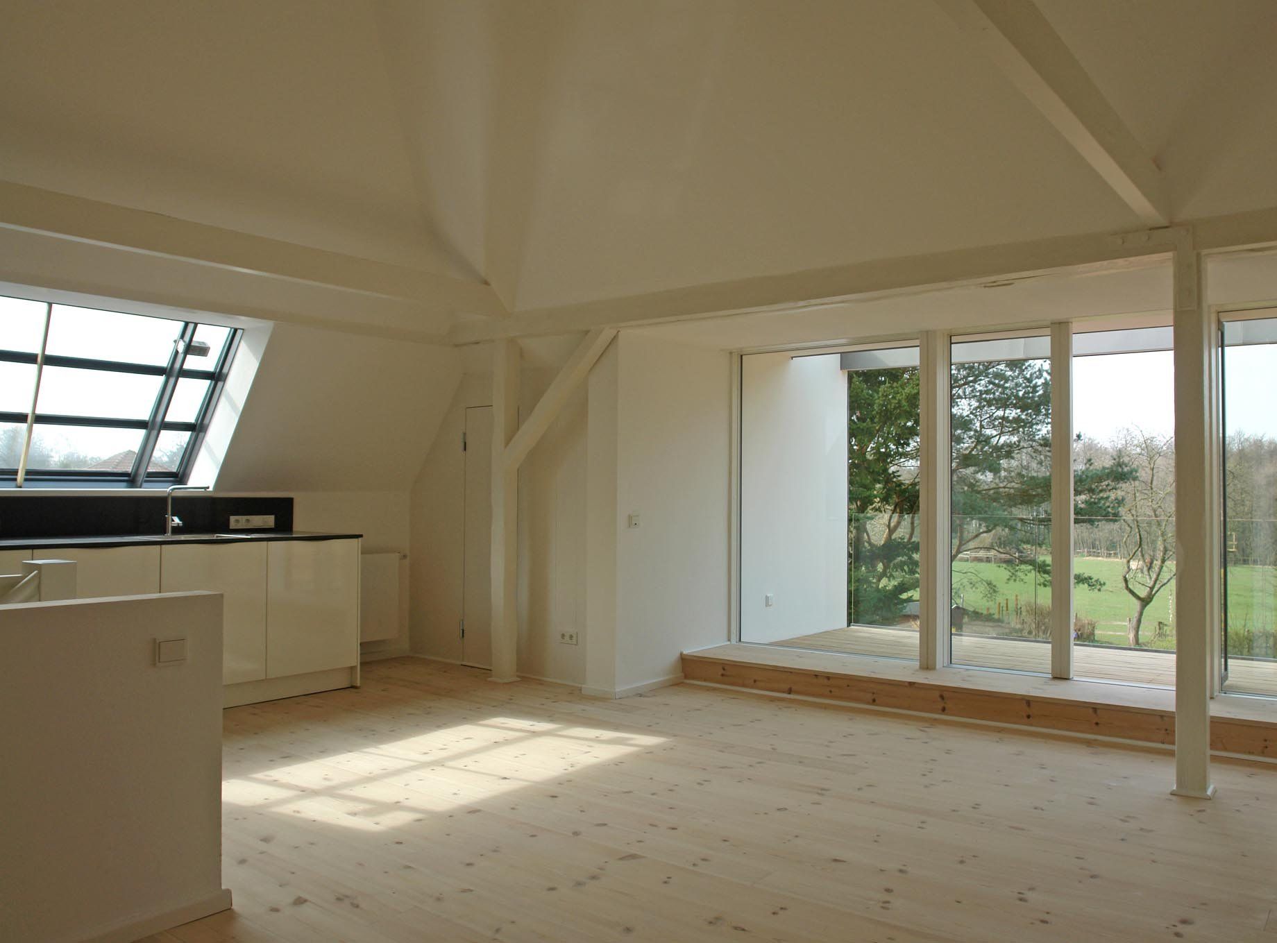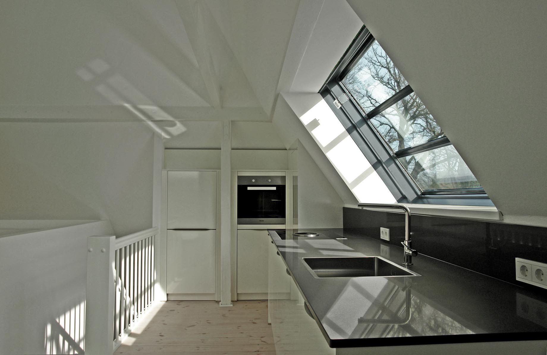 Bei der Anpassung eines 1925 erbauten, denkmalgeschützten Mehrfamilienhauses an zeitgemäße Wohnstandards entstanden unter dem neu ausgebauten Walmdach zwei exklusive, lichtdurchflutete Maisonette-Wohnungen mit großzügigem Raumvolumen und Ausblick ins Grüne.