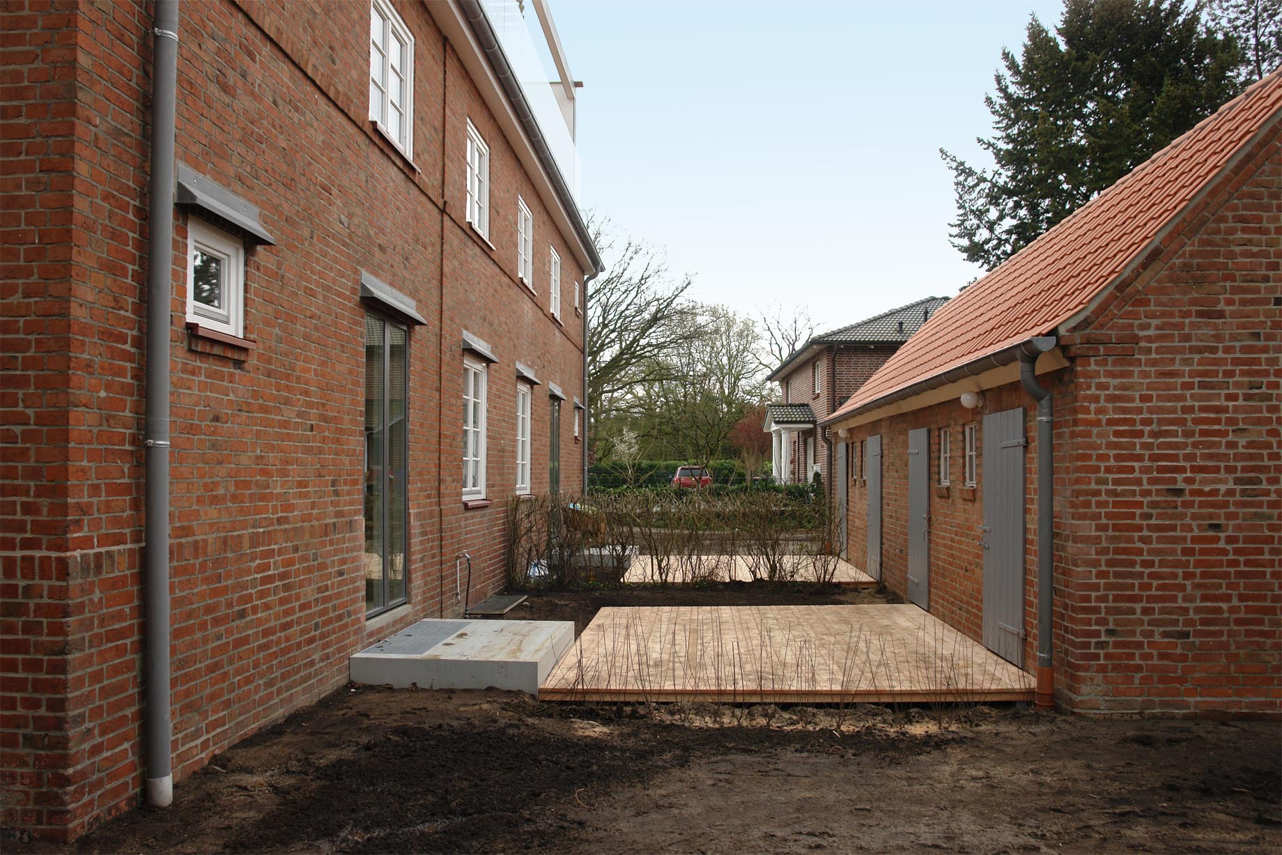 Neue Terrassentüren öffnen die Wohnräume über vorgelagerte Holzdecks zum Garten, der von den behutsam sanierten Nebengebäuden räumlich gefasst wird.