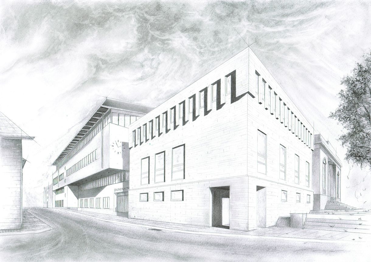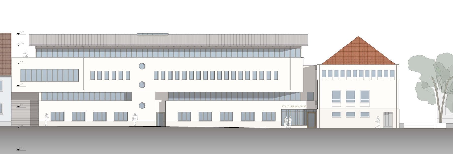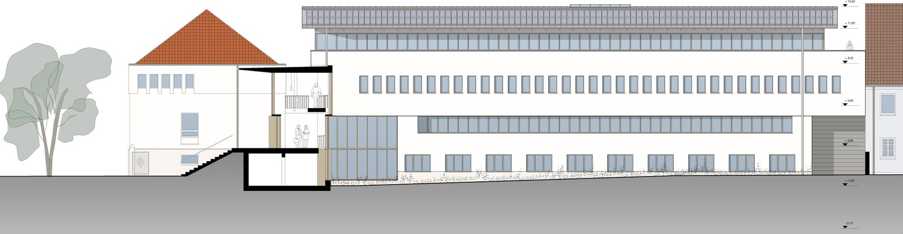 Der Gebäudesockel schließt nach Norden höhengleich und nach Süden farbgleich an die Nachbargebäude an. Den oberen Abschluss des Sockelgeschosses selbst bildet das Fensterband* des Erdgeschosses aus. Der durchgehende Riegel des Obergeschosses fügt sich hinsichtlich seiner Höhe, Gliederung und Proportion einfügsam in den umgebenden Maßstab ein und führt die prägnante Durchfensterung des Rathaus-Anbaus fort. Das allseitig umlaufende Fensterband* im Dachgeschoss löst die tatsächliche Traufhöhe* des flach geneigten Daches wirkungsvoll auf und ermöglicht einen vollständigen Verzicht auf Dachflächenfenster, Dachgauben oder sonstige Dachaufbauten.
